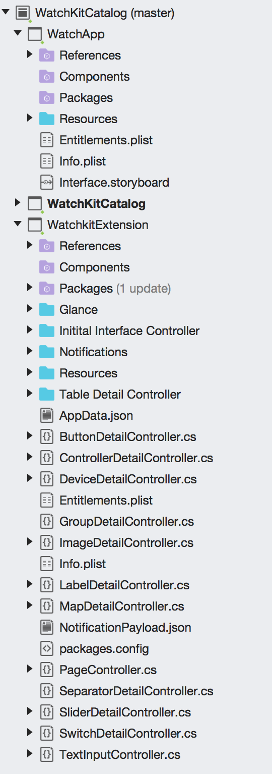 Regardless of which version of watchOS is targeted, in Visual Studio for Mac’s Solution Pad a complete solution will look something like this: