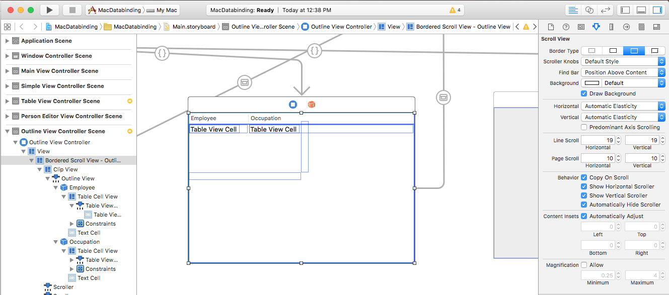 data binding against an Outline View is very similar to binding against a Table View. The key difference is that we'll be using a Tree Controller instead of an Array Controller to provide the bound data to the Outline View. For more information on working with Outline Views, please see our Outline Views documentation.