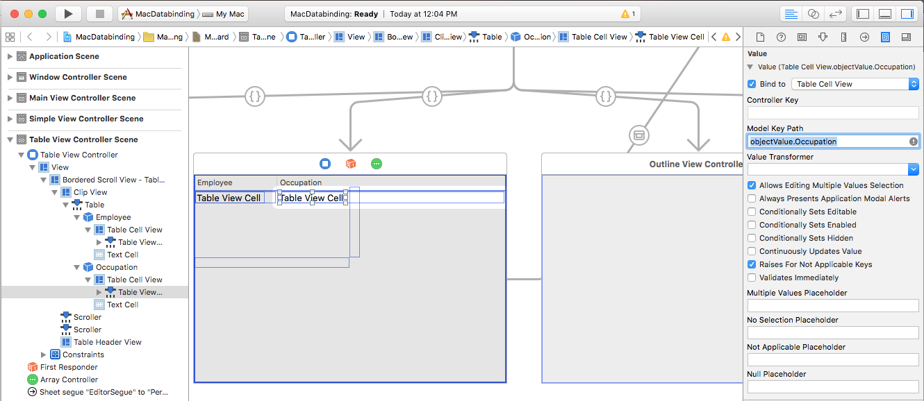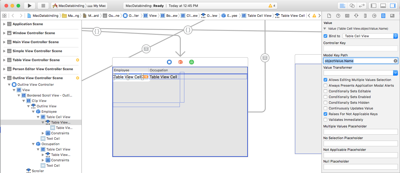 objectValue.Namefor the Model Key Path:objectValueis the currentPersonModelin the array being managed by the Tree Controller.Select the Table View Cell under the Occupation column. In the Bindings Inspector under the Value turndown, select Bind to and Table Cell View. Enter