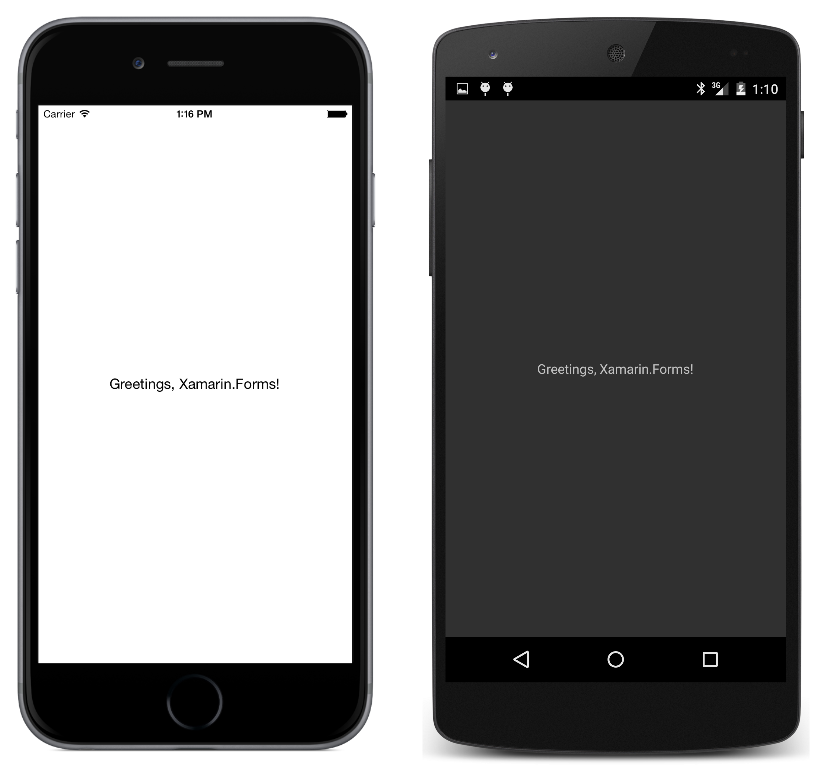 The GreetingsPage constructor instantiates a Label view, which is the Xamarin.Forms view that displays text. The Text property is set to the text displayed by the Label. This program sets the Label to the Content property of ContentPage. The constructor of the App class then instantiates GreetingsPage and sets it to its MainPage property.