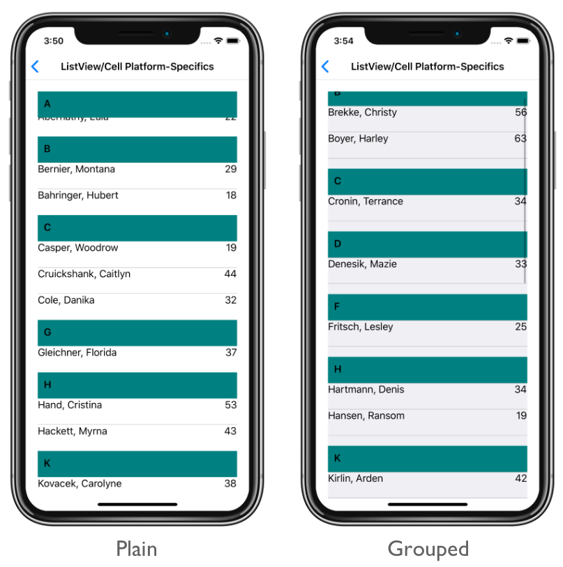 The ListView.On<iOS> method specifies that this platform-specific will only run on iOS. The ListView.SetGroupHeaderStyle method, in the Xamarin.Forms.PlatformConfiguration.iOSSpecific namespace, is used to control whether ListView header cells float during scrolling. The GroupHeaderStyle enumeration provides two possible values: