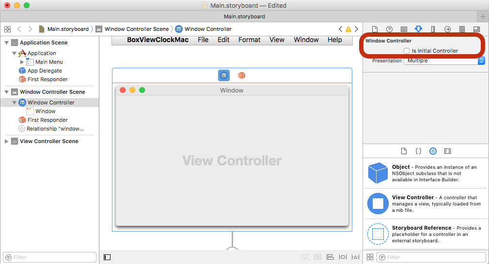 AppDelegateto initialize Xamarin.Forms, create a window, and load the Xamarin.Forms application (remembering to set an appropriateTitle). If you have other dependencies that need to be initialized, do that here as well.using Xamarin.Forms; using Xamarin.Forms.Platform.MacOS; // also add a using for the Xamarin.Forms project, if the namespace is different to this file ... [Register("AppDelegate")] public class AppDelegate : FormsApplicationDelegate { NSWindow window; public AppDelegate() { var style = NSWindowStyle.Closable | NSWindowStyle.Resizable | NSWindowStyle.Titled; var rect = new CoreGraphics.CGRect(200, 1000, 1024, 768); window = new NSWindow(rect, style, NSBackingStore.Buffered, false); window.Title = "Xamarin.Forms on Mac!"; // choose your own Title here window.TitleVisibility = NSWindowTitleVisibility.Hidden; } public override NSWindow MainWindow { get { return window; } } public override void DidFinishLaunching(NSNotification notification) { Forms.Init(); LoadApplication(new App()); base.DidFinishLaunching(notification); } }Double-click Main.storyboard to edit in Xcode. Select the Window and uncheck the Is Initial Controller checkbox (this is because the code above creates a window):