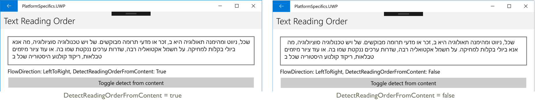 This Universal Windows Platform platform-specific enables the reading order (left-to-right or right-to-left) of bidirectional text in Entry, Editor, and Label instances to be detected dynamically. It's consumed in XAML by setting the InputView.DetectReadingOrderFromContent (for Entry and Editor instances) or Label.DetectReadingOrderFromContent attached property to a boolean value: