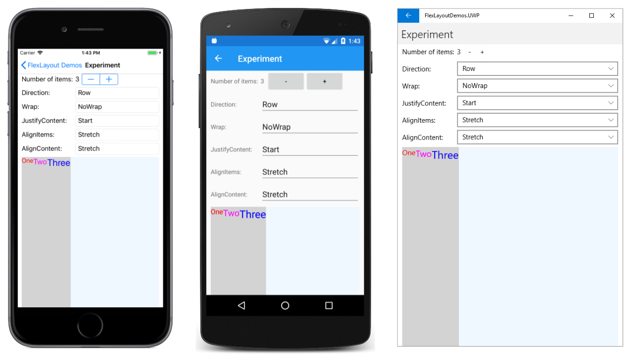 The iOS screenshot at the left shows the two Label elements being given heights in device-independent units. The Android screen shows them being given heights that are a fraction of the total height of the FlexLayout. If the Basis is set at 100%, then the child is the height of the FlexLayout, and will wrap to the next column and occupy the entire height of that column, as the UWP screenshot demonstrates: It appears as if the five children are arranged in a row, but they're actually arranged in five columns.