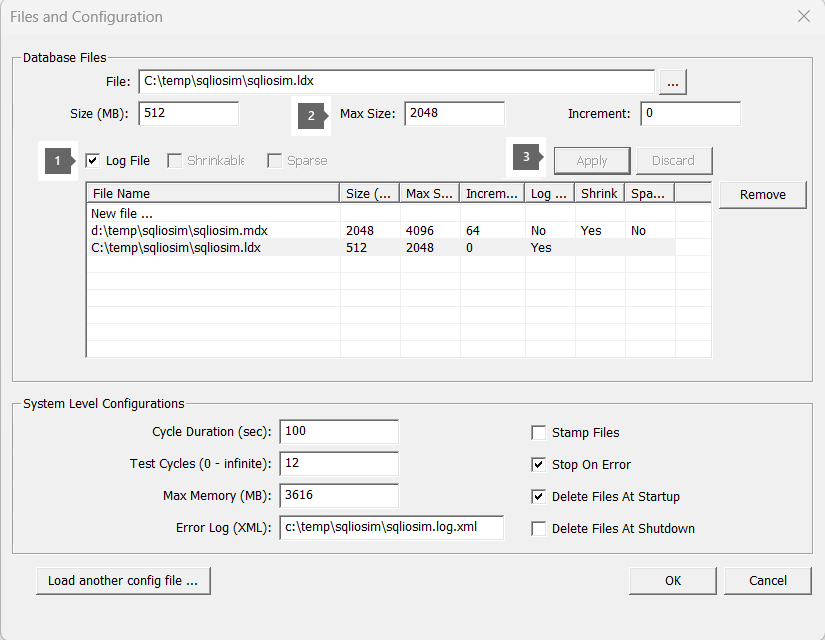 - Use the Files and Configuration dialog box after you run the SQLIOSim.exe file.