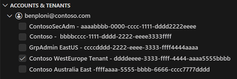 If you have multiple guest accounts associated with your login, you can seamlessly switch between accounts. To switch between accounts, select the account name at the bottom left of the Visual Studio Code window. Only one account can be selected at a time.