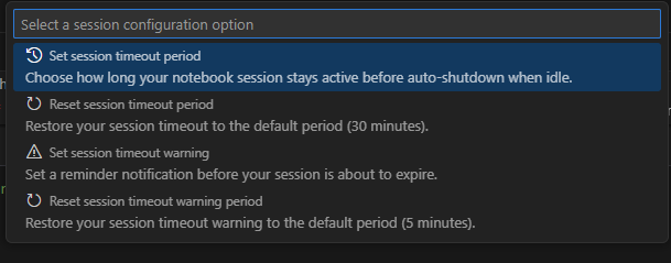 You can set the session timeout and timeout warnings for interactive notebooks. To change the timeout, select the connection status in the status bar at the bottom of the notebook. Choose from the following options: