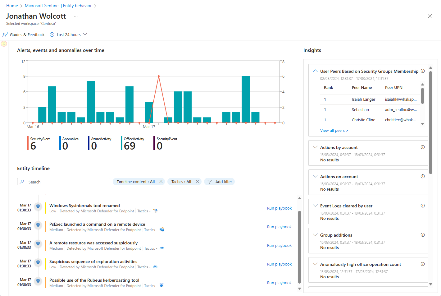 Entity insights are queries defined by Microsoft security researchers to help your analysts investigate more efficiently and effectively. The insights are presented as part of the entity page, and provide valuable security information on hosts and users, in the form of tabular data and charts. Having the information here means you don't have to detour to Log Analytics. The insights include data regarding sign-ins, group additions, anomalous events and more, and include advanced ML algorithms to detect anomalous behavior.