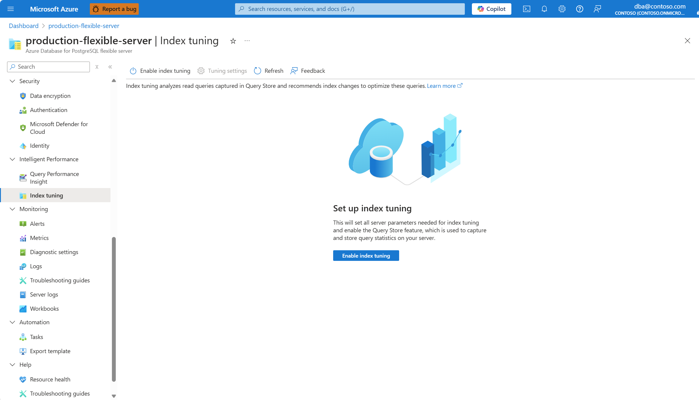 Screenshot that shows the Index tuning menu option under the Intelligent Performance section, to disable index tuning.