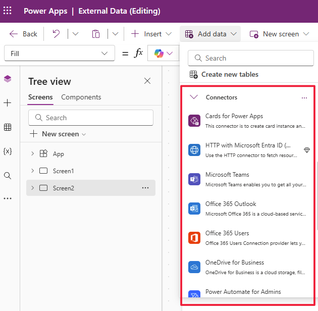 Connectors are more than just access points; they unlock numerous possibilities. Some connectors provide tables filled with data, while others offer actions that allow you to interact with data in unique ways. Some connectors even offer a combination of both tables and actions. Additionally, you can create custom connectors tailored to your specific needs, adding a personalized touch to your app-building process. Below is an image of a few of the many connectors available in a canvas app.