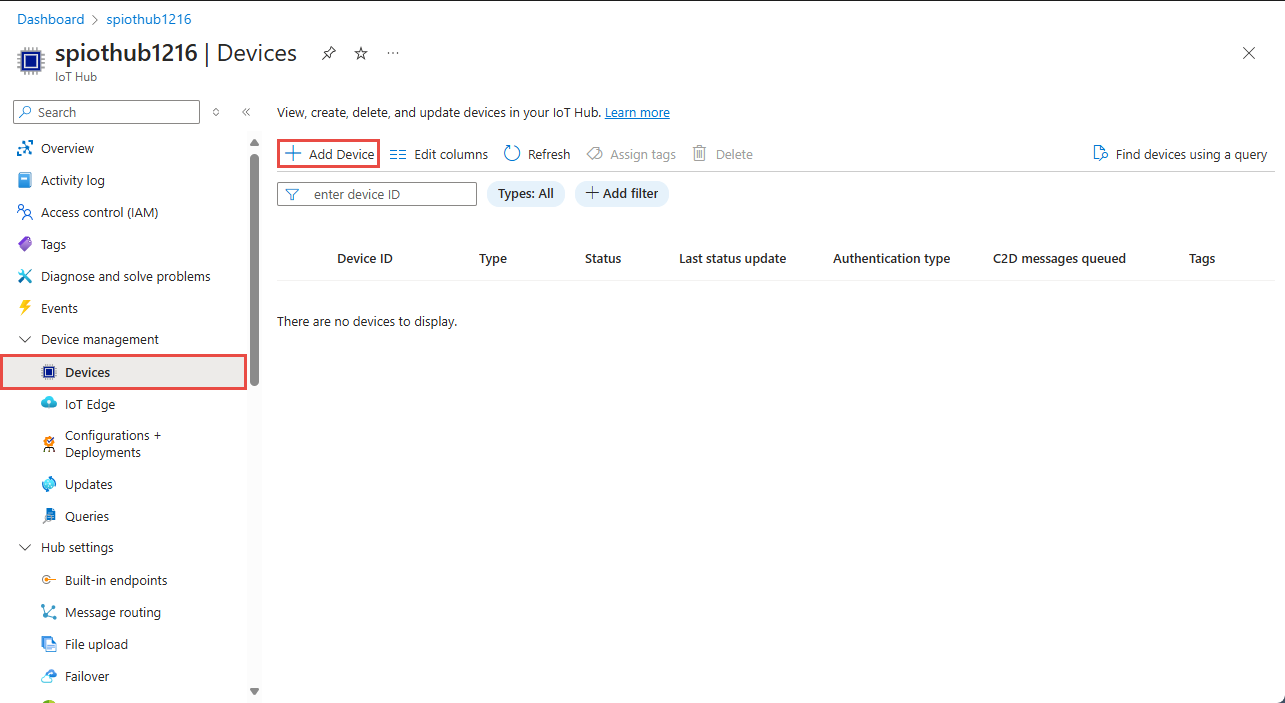 On the IoT Hub page, select Devices on the left menu, and then select + Add device.