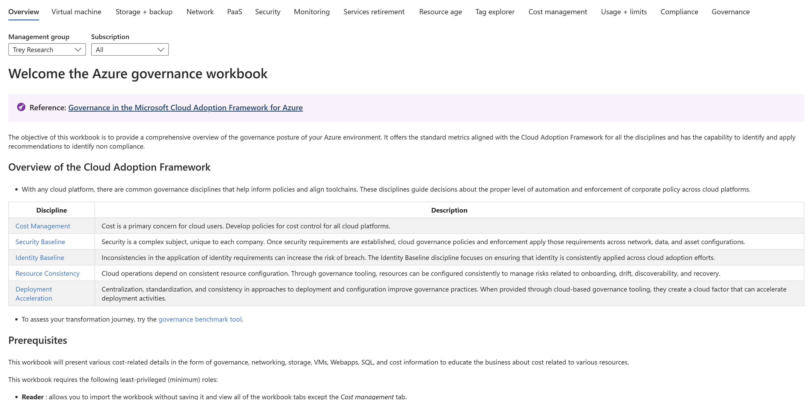 The governance workbook is an Azure Monitor workbook that provides a comprehensive overview of the governance posture of your Azure environment. It includes the standard metrics aligned with the Cloud Adoption Framework for all disciplines and has the capability to identify and apply recommendations to address noncompliant resources.