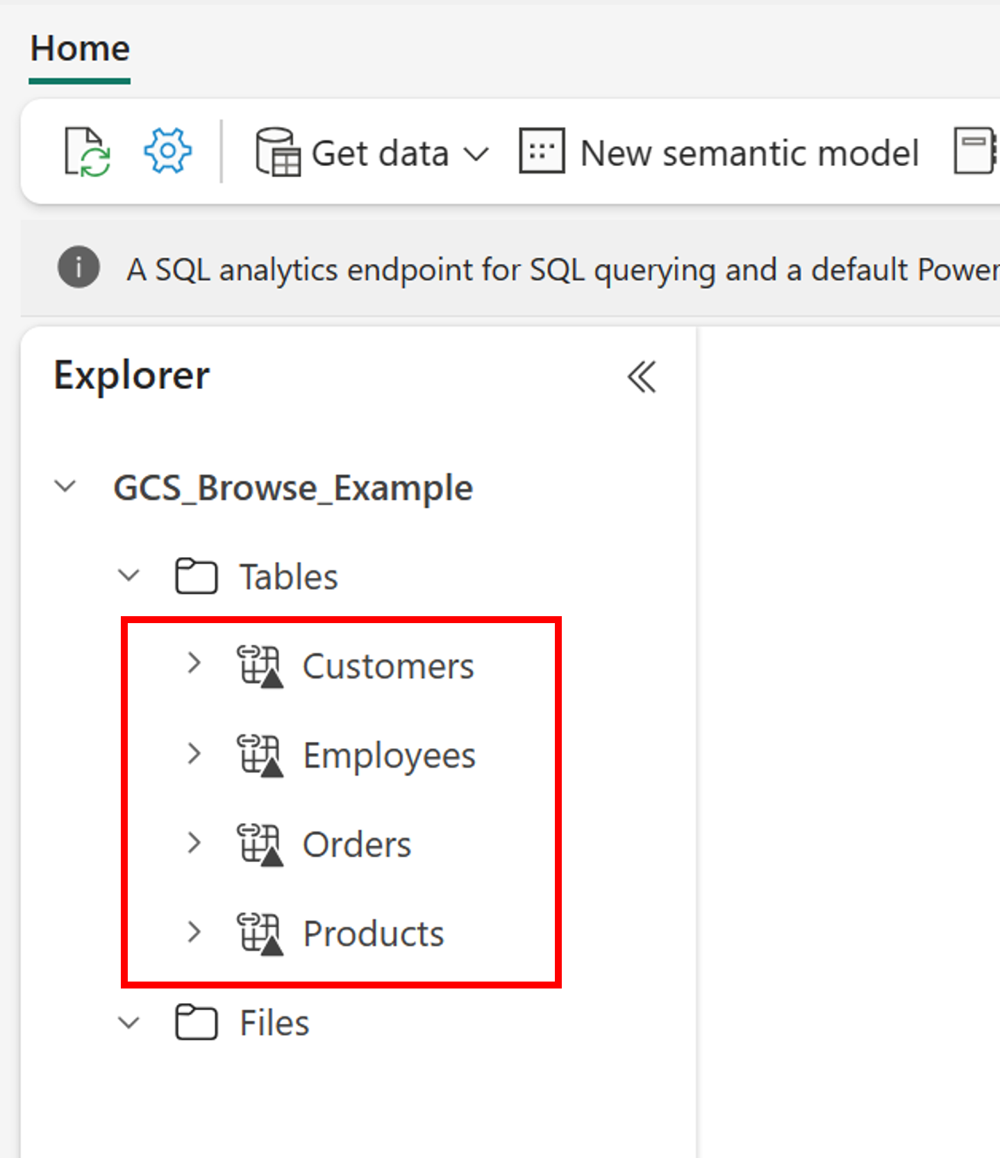 The lakehouse automatically refreshes. The shortcut appears in the left Explorer pane.