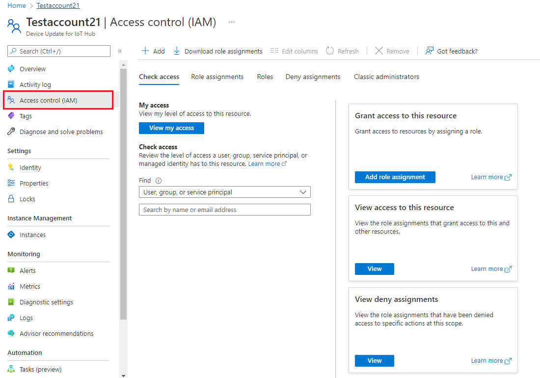 In your Device Update account, select Access control (IAM) from the navigation menu.