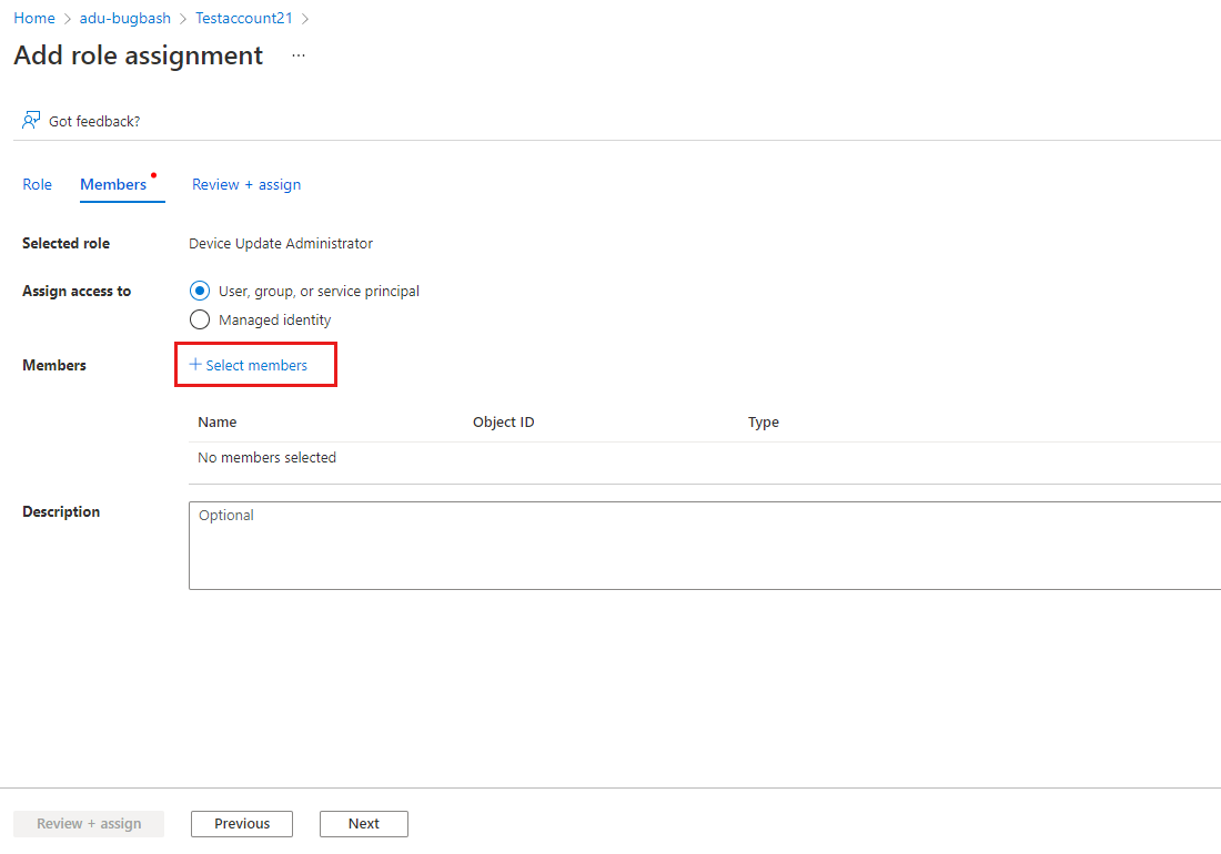 In order for other users to have access to Device Update, they must be granted access to this resource. You can skip this step if you assigned the Device Update administrator role to yourself during account creation and don't need to provide access to other users or applications.