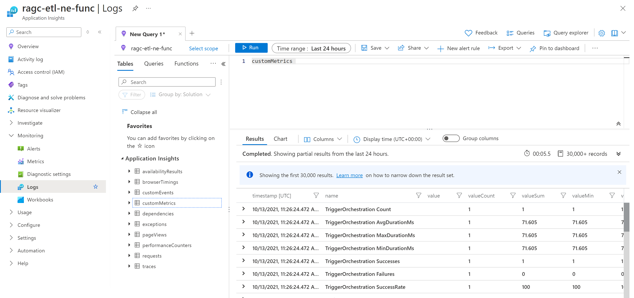 customMetrics | These runtime-generated logs provide counts and averages of function invocations over a configurable period of time. The default period is 30 seconds or 1,000 results, whichever comes first. Examples are the number of runs, success rate, and duration. All of these logs are written at the Information level. If you filter at Warning or higher, you don't see any of this data. |