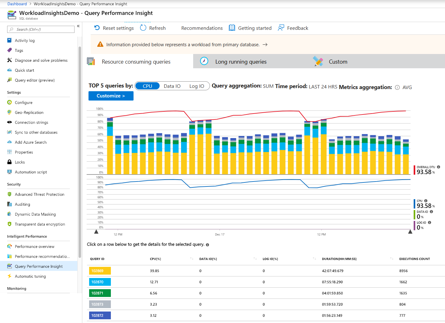 Query Performance Insight provides intelligent query analysis for single and pooled databases. It helps identify the top resource consuming and long-running queries in your workload. This helps you find the queries to optimize to improve overall workload performance and efficiently use the resource that you are paying for. Query Performance Insight helps you spend less time troubleshooting database performance by providing: