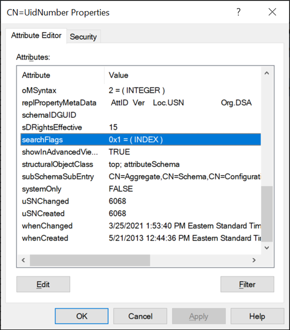 In comparison, an attribute that is indexed in Active Directory for LDAP searches would have the value of 0x1 (or some combination including that value), such as the uidNumber: