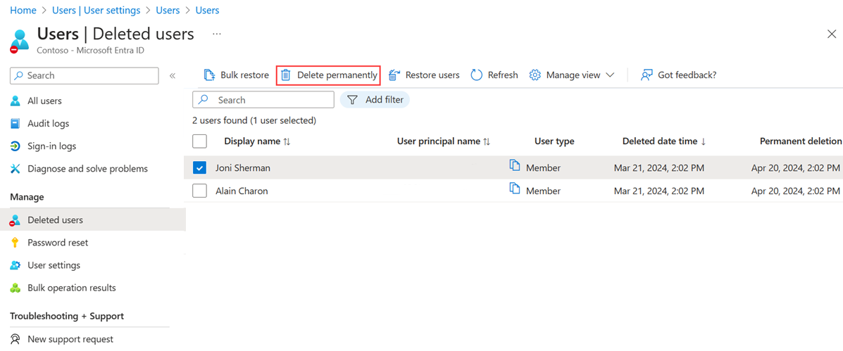 You can view your restorable users, restore a deleted user, or permanently delete a user using the Microsoft Entra admin center.