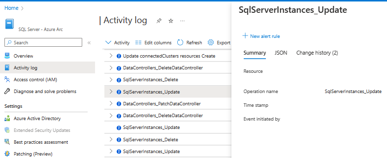 Activity logs for SQL Server enabled by Azure Arc provide insight into events related to SQL Server enabled by Azure Arc and View Azure Arc-enabled inventory resources. Activity logs contain events that correspond to the creation and modification of resources. These events include SQL Server instance updates (SqlServerInstance_Update), SQL Server database updates (SqlServerDatabases_Update), and writing of tags to resources.