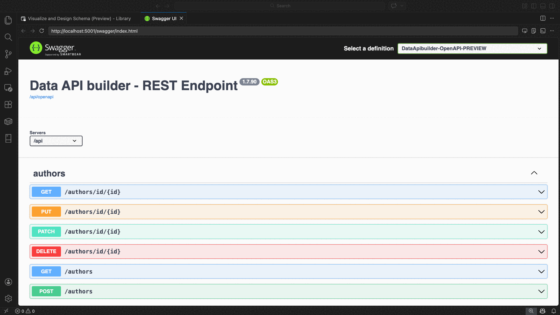 The following example shows the Swagger UI for testing REST endpoints directly in Visual Studio Code: