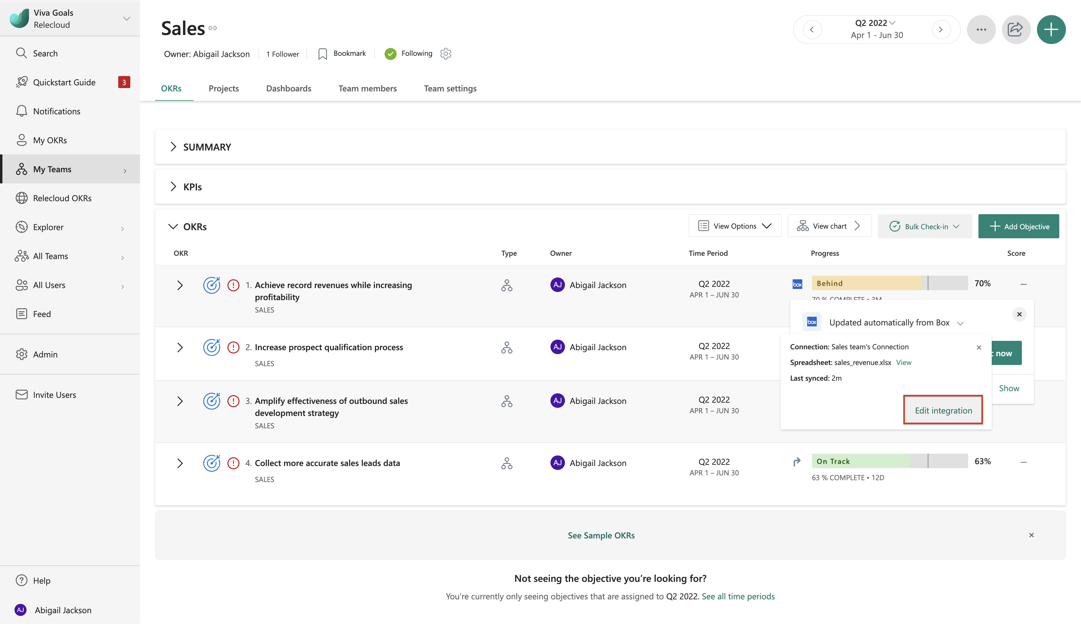 Select the KPIs you want to reflect within the objective from your spreadsheet in Box. To do this, select edit integration, which appears when you select the Box icon.