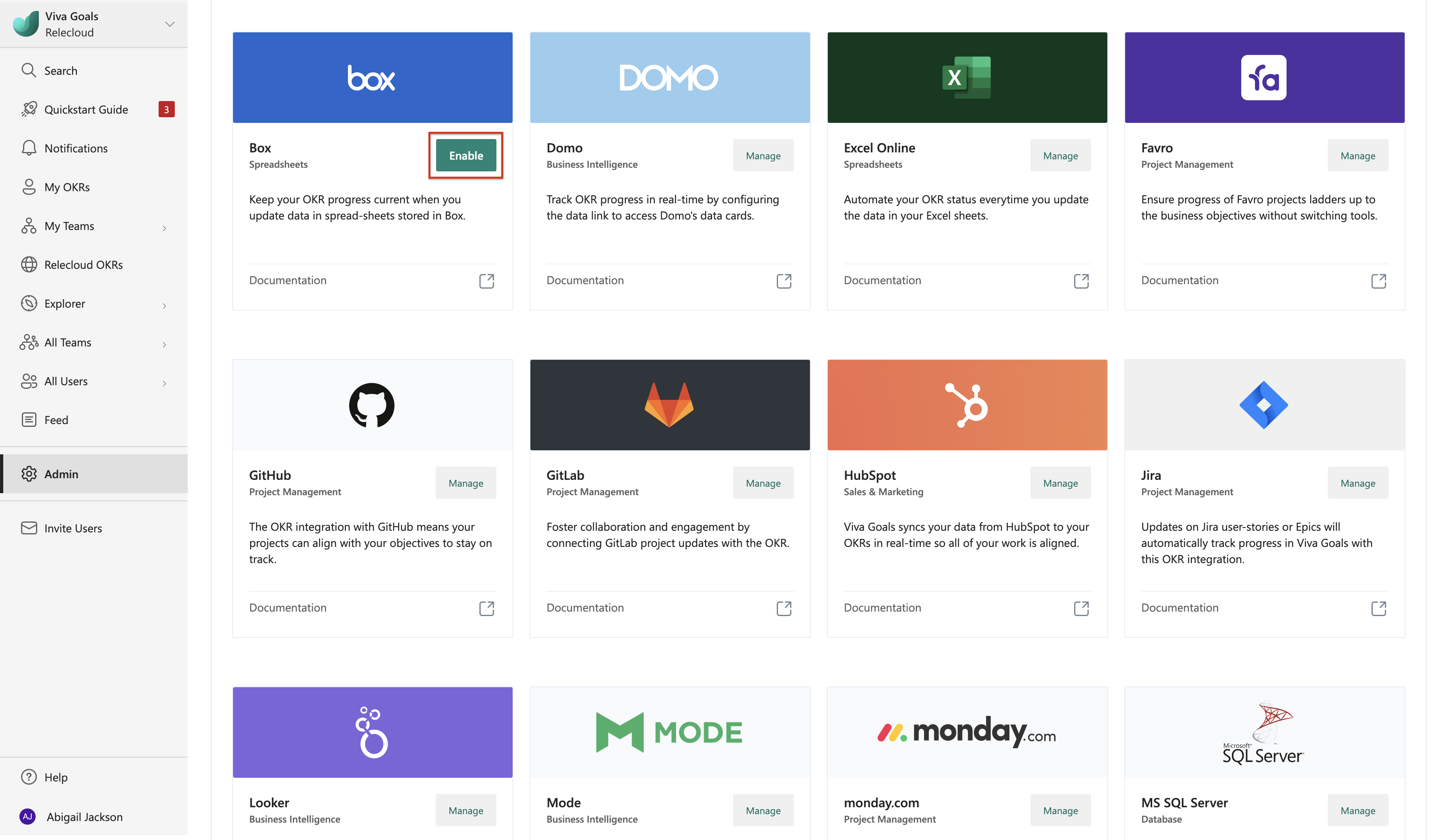 After you configure the connection, the next step is to link OKRs to the spreadsheets in Box.