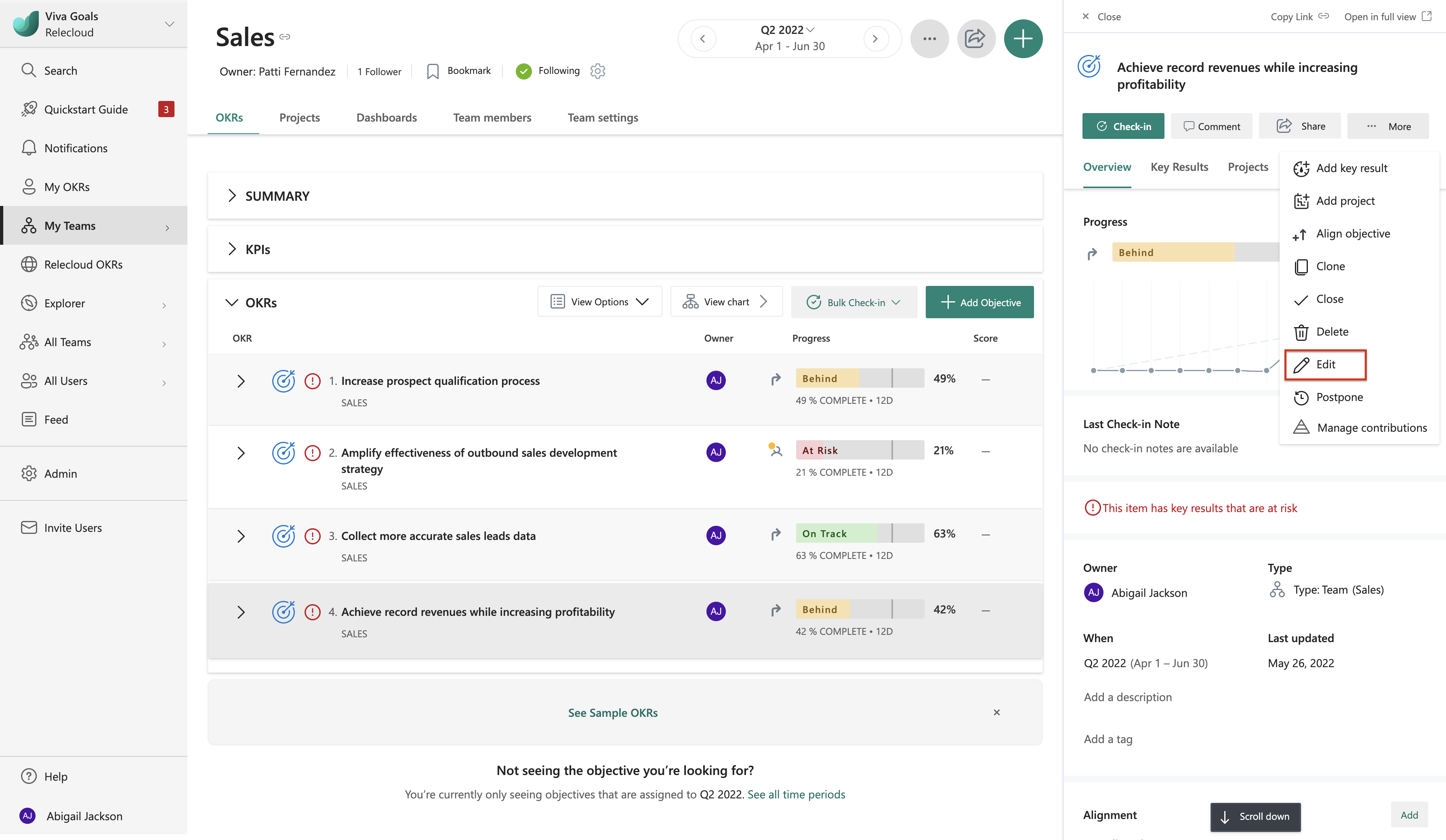 When you link your objectives to the corresponding key performance indicator (KPIs) within spreadsheets in Box, the status of your OKR will be updated based on the data in your spreadsheets. Viva Goals automatically syncs the values for you and charts your progress toward the goal, saving time while keeping your OKRs current.