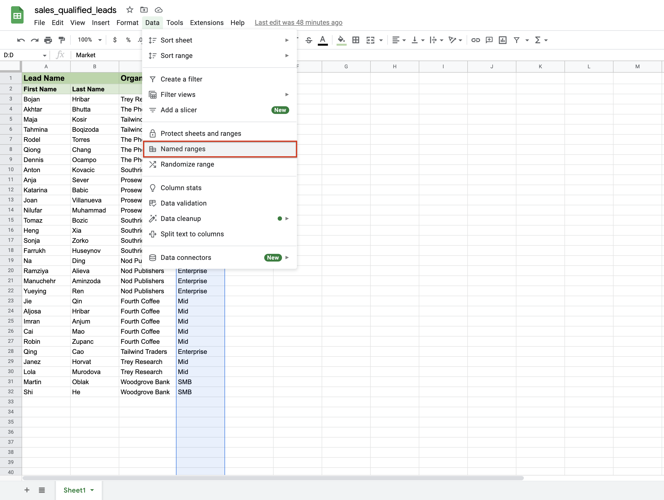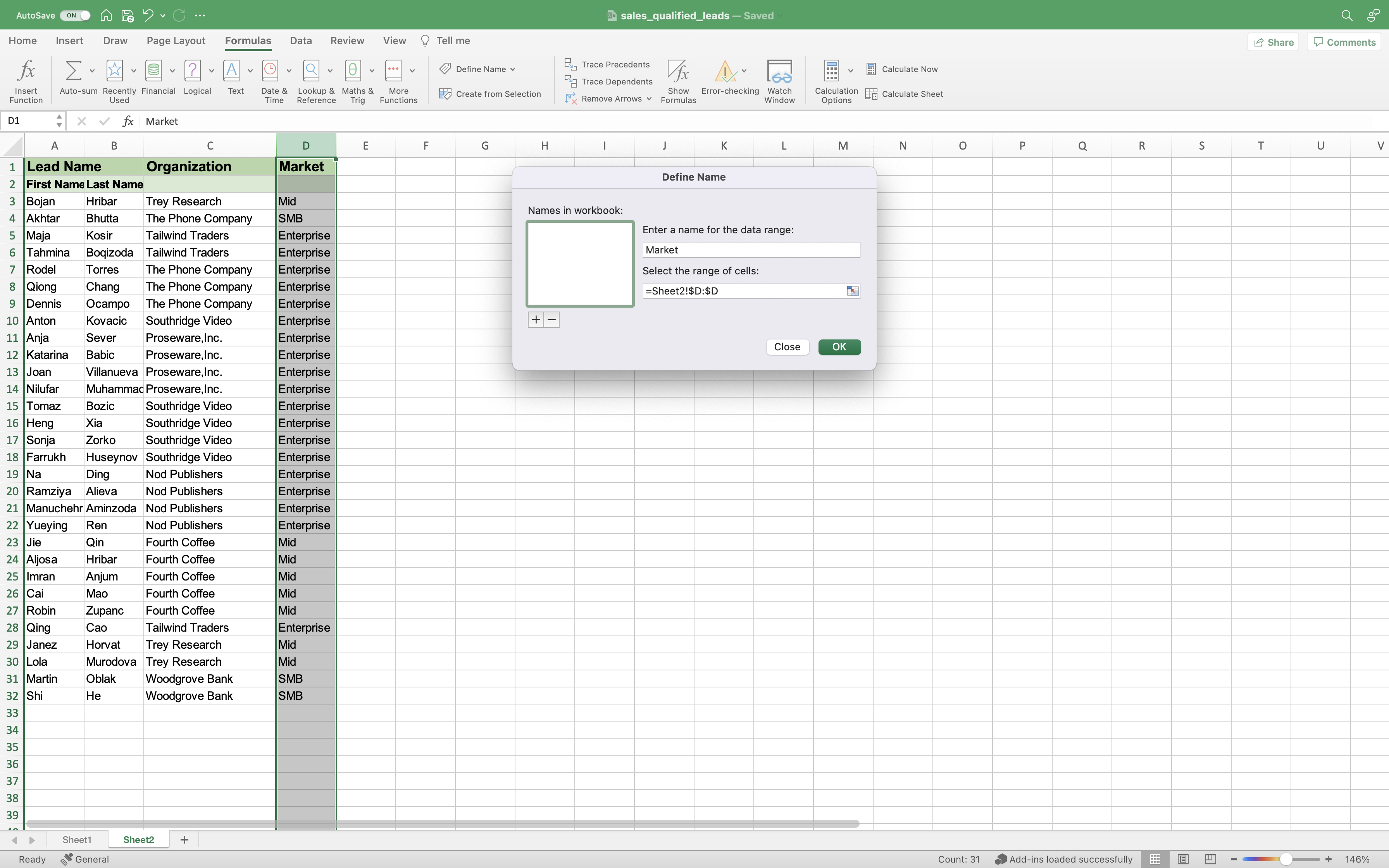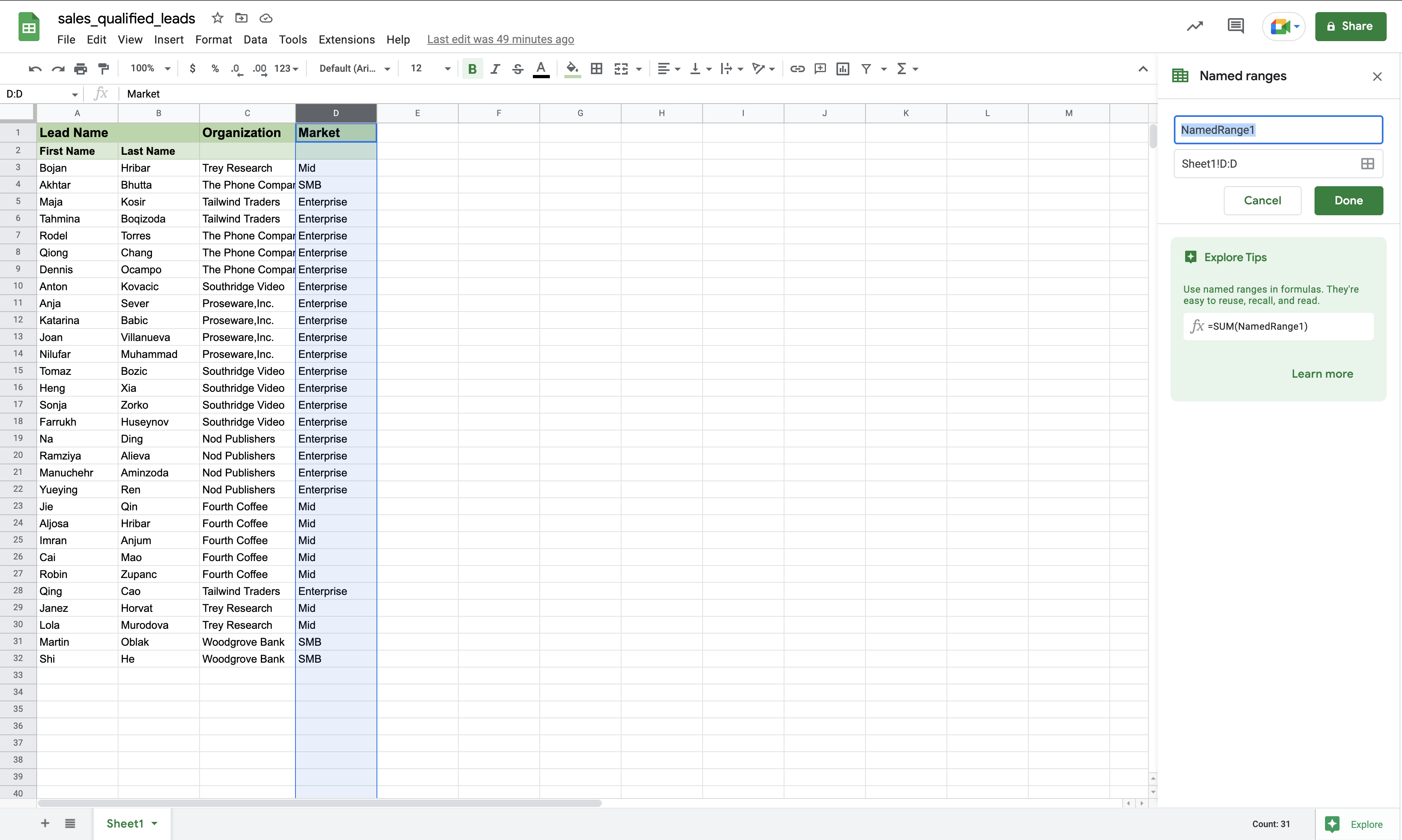 You can create named ranges in Excel (.xlsx) or Google Sheets to keep better track of values in your Box spreadsheets. Instead of using a column and row number to describe a range of cells, you could give the cell a unique range name that can be referred to.