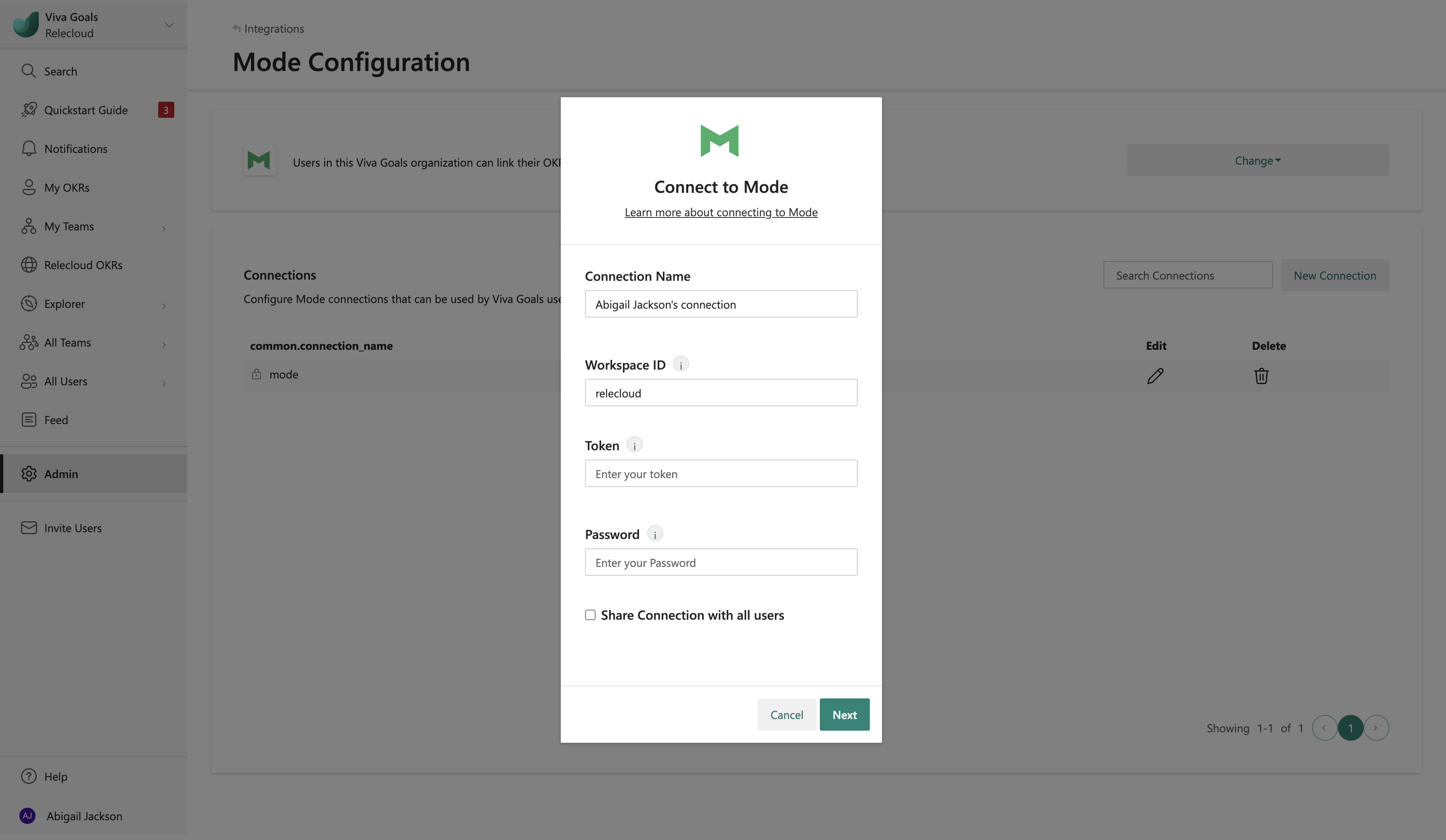After you have your Mode workspace ID and API token, add the token to the connection page in Viva Goals.