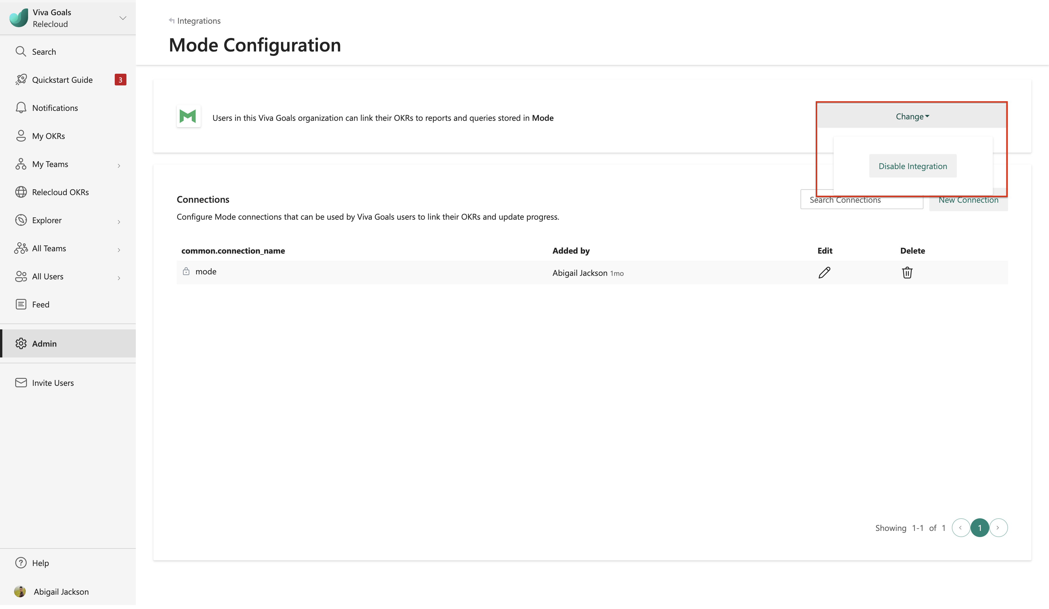 The first step to set up the Mode integration is to connect your Mode account to Viva Goals. In the sidebar, select Admin and then Integrations.