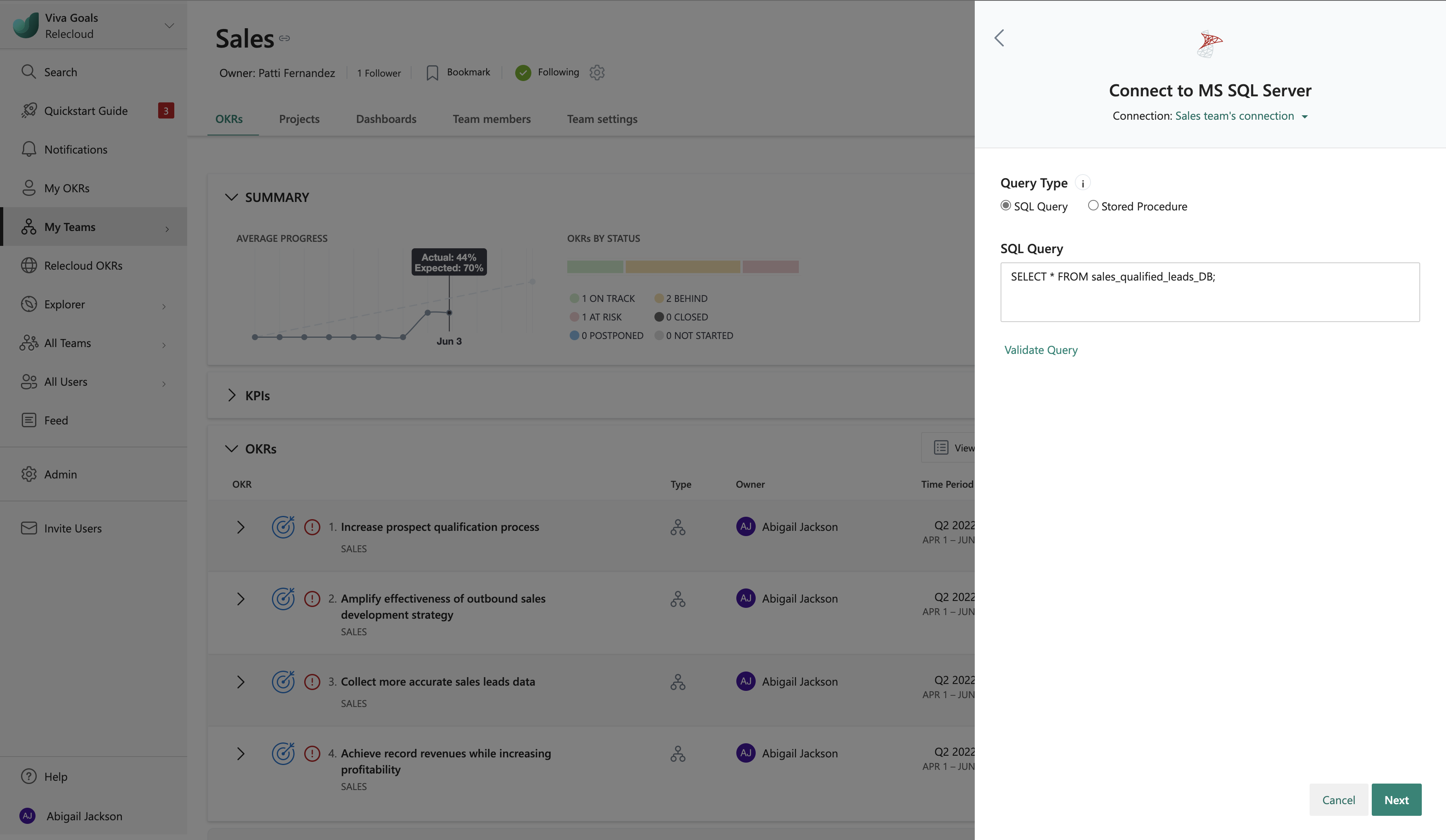 After your integration is set up, you can measure your OKR progress by connecting your OKRs with a Microsoft SQL Server database.