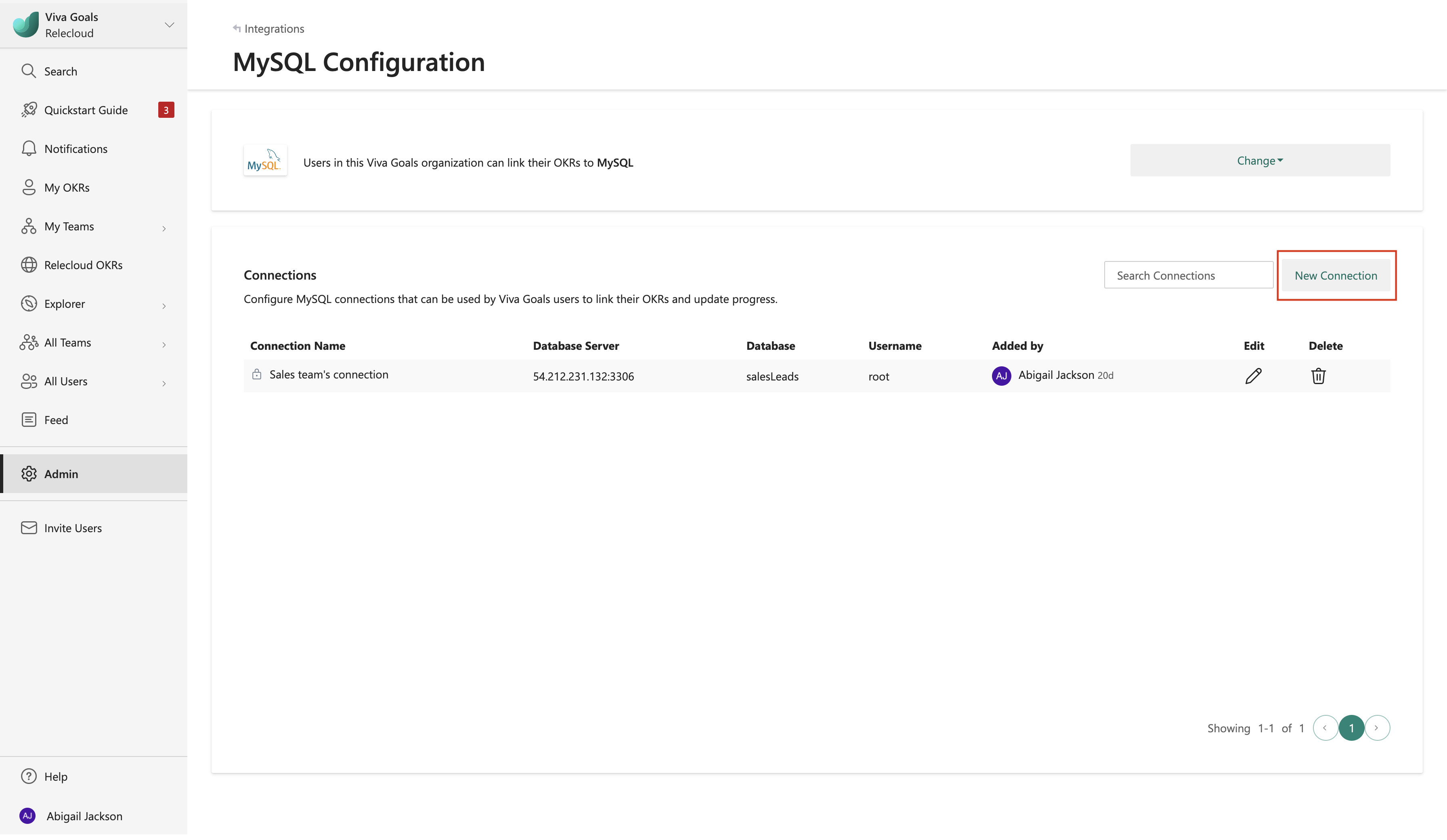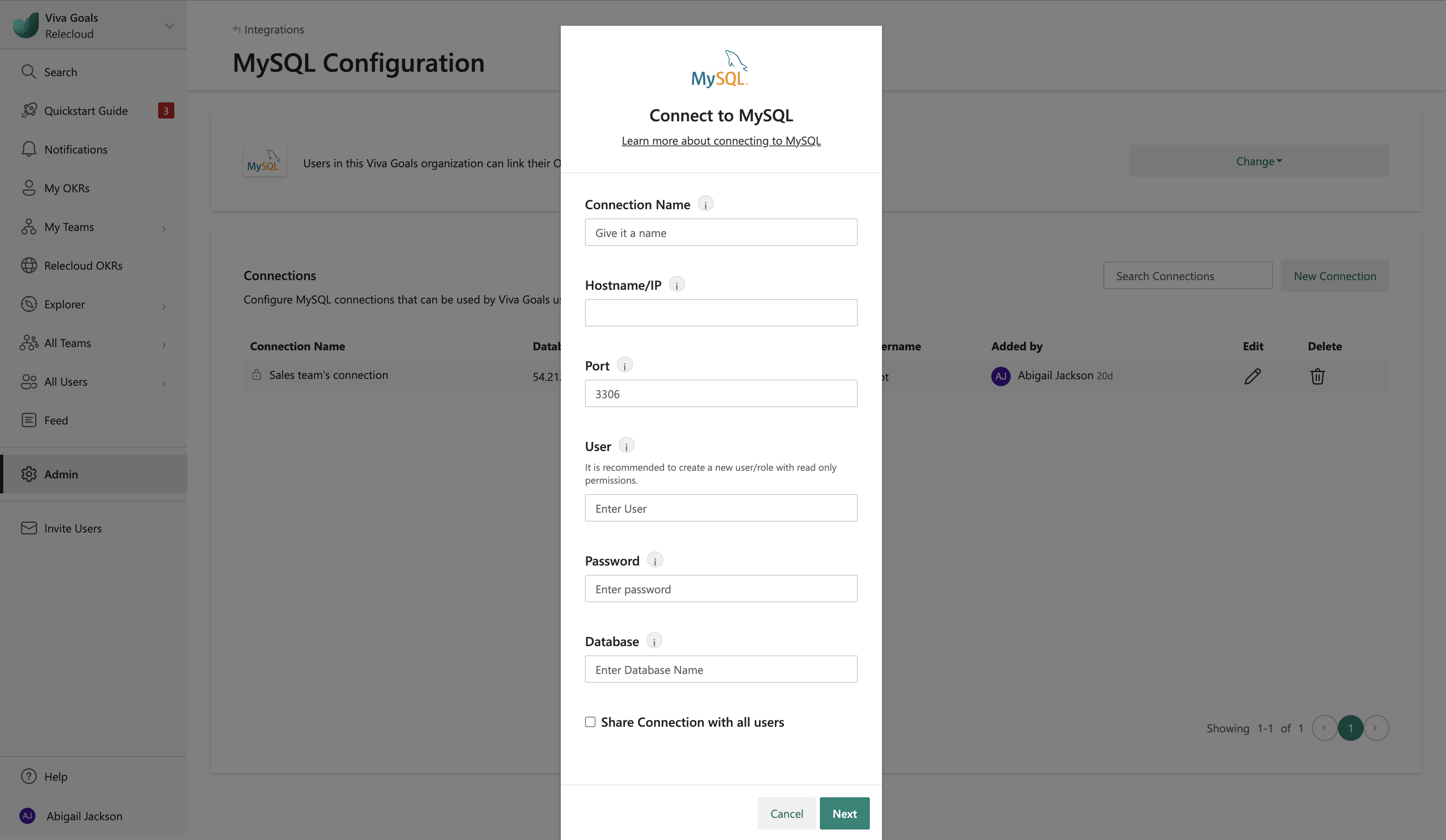 Viva Goals allows you to connect with multiple databases. Select New Connection to connect to another database. Differentiate these connections by name. The names will be displayed to other users when they link their OKRs with MySQL databases.
