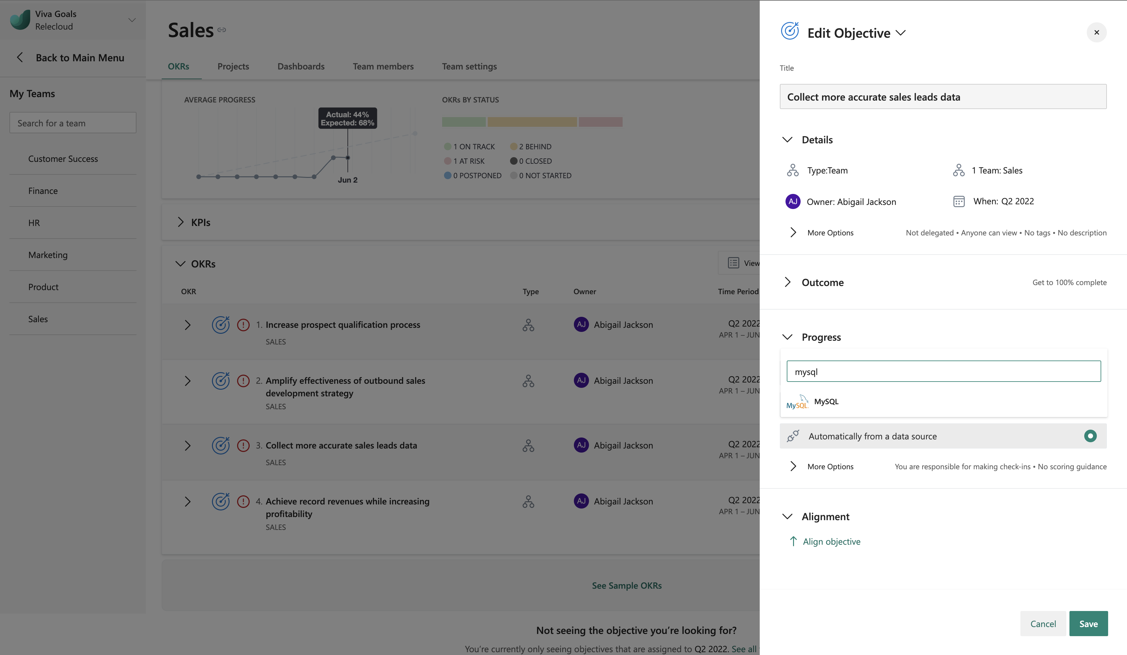 Let's consider this example: You use MySQL databases to store information on leads from multiple sources. You have an objective in Viva Goals to increase qualified leads by 40 percent every quarter. When you link this objective to the corresponding database in MySQL, the status of your OKR will be updated based on the data in your database. Viva Goals will automatically sync the values for you and chart your progress toward the goal, saving time while keeping your OKRs current.