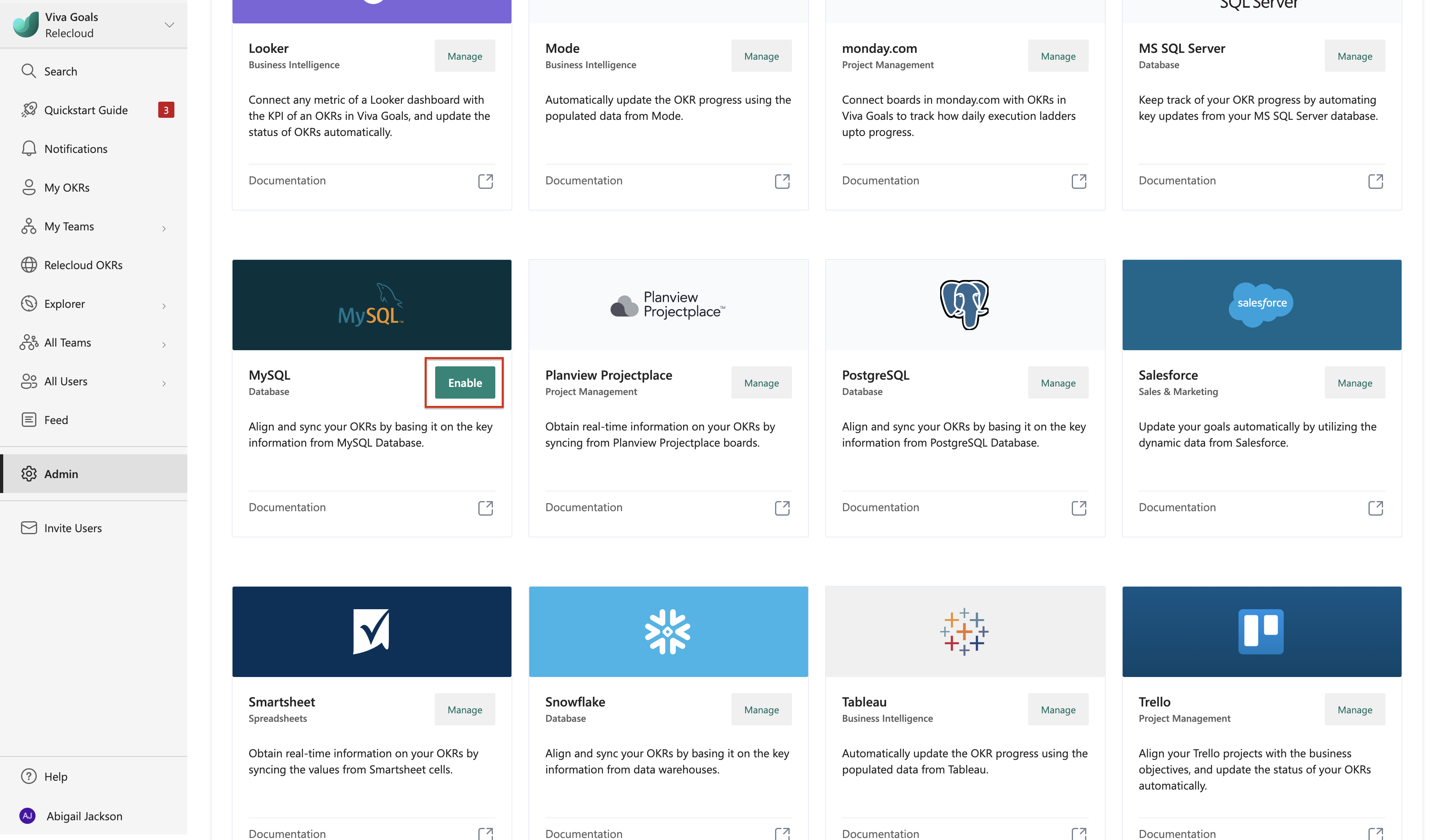 The Viva Goals MySQL integration lets you update your objectives and key result (OKR) progress automatically based on data in your MySQL database.