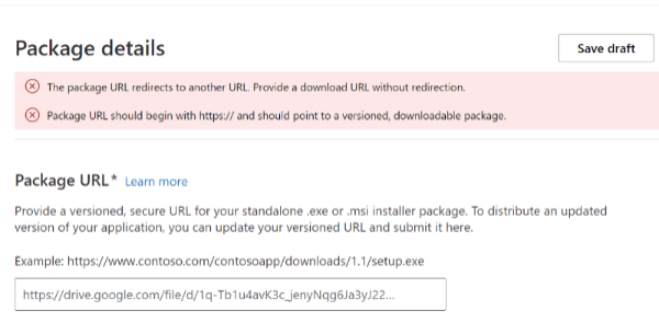 The following image shows the message that appears on the Microsoft Store dashboard when using the GoogleDrive link.