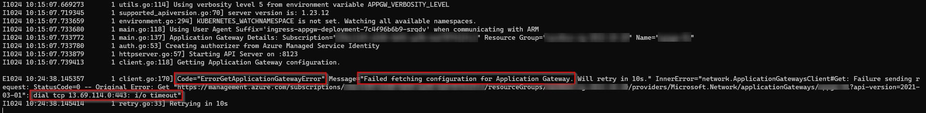 If for some reason this connection cannot be established, the AGIC pod logs will display the error "ErrorGetApplicationGatewayError" with message "Failed fetching configuration for Application Gateway", followed by the lower level TCP error message "dial timeout" and "Retrying in 10s", which indicates AGIC will keep retrying to connect to this endpoint.