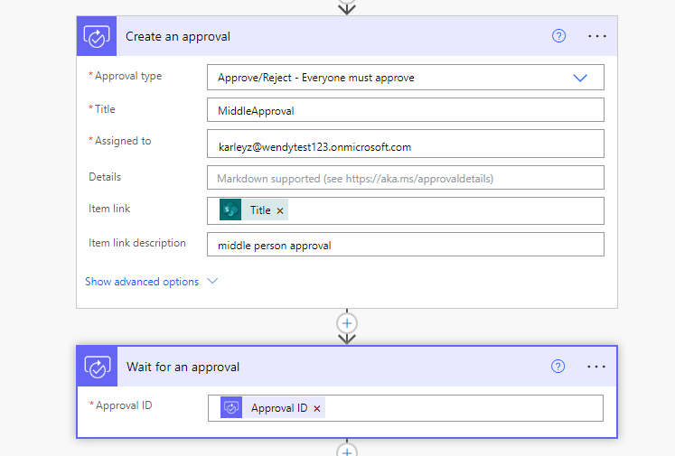 First, you create an approval, after which the next step creates a wait for an approval.