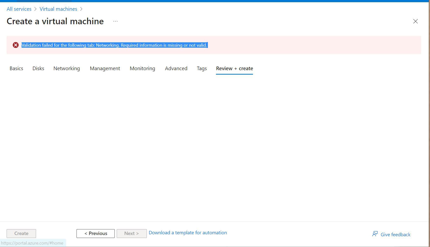 If you select Review + create now, you may get a Networking error: