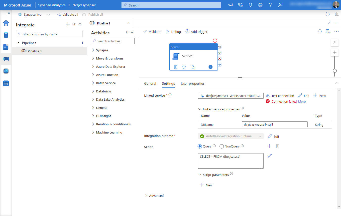 I am testing Synapse with a very simple setup and I wanted to execute an SQL script from within a Pipeline against a Serverless SQL database within the same synapse workspace.