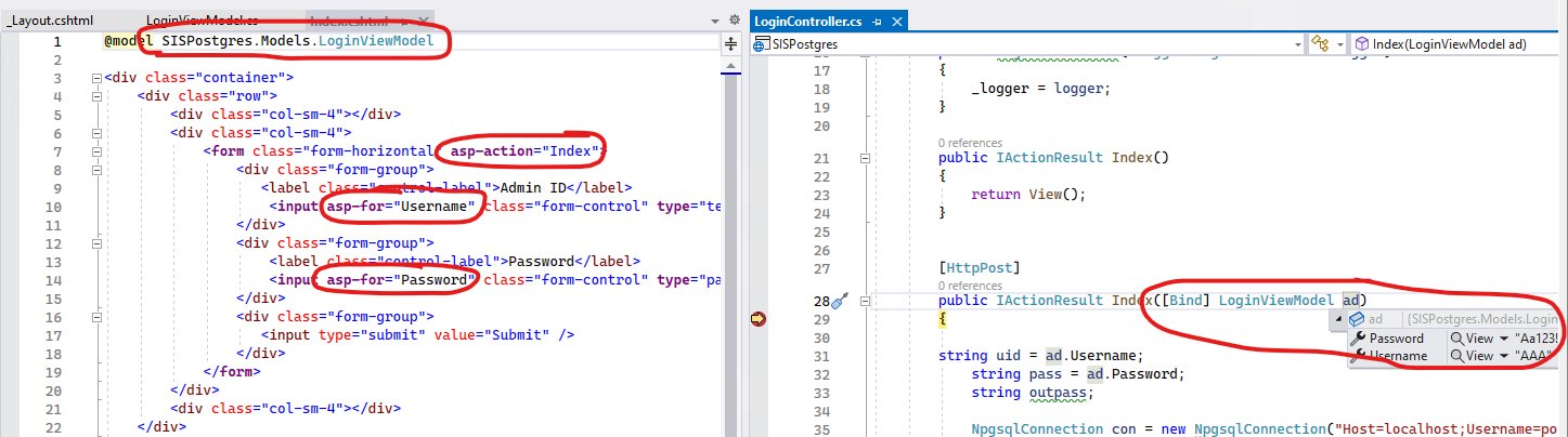 First, about the Login page, it seems that you have already solved the problem. In your code, after clicking the submit button, it will submit the LoginViewModel to the Index (Post) method. Then, you can get the entered value from the LoginViewModel.
