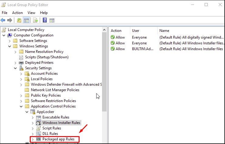 <FilePublisherRule Id="a9e18c21-ff8f-43cf-b9fc-db40eed693ba" Name="(Default Rule) All signed packaged apps" Description="Allows members of the Everyone group to run packaged apps that are signed." UserOrGroupSid="S-1-1-0" Action="Allow">