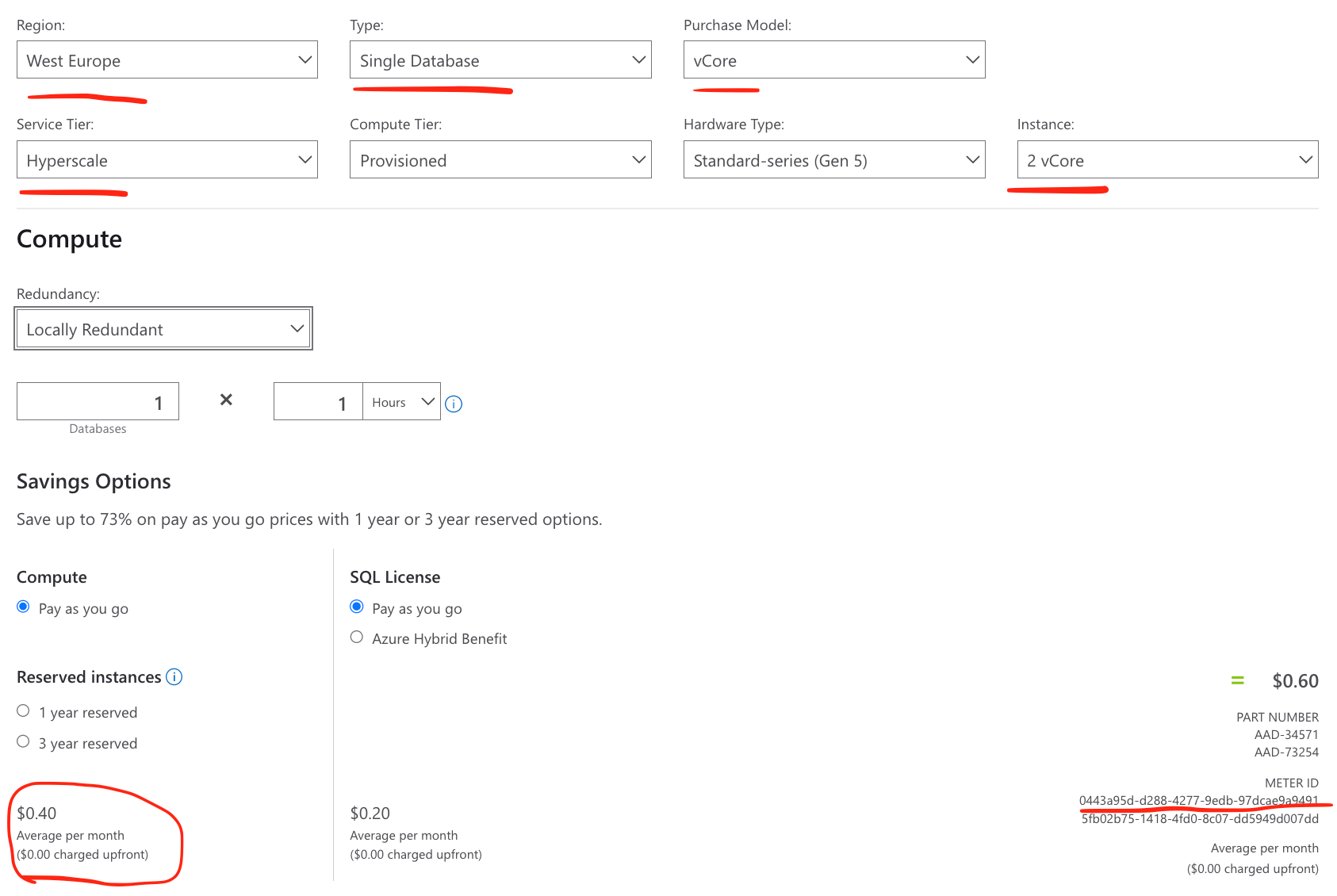 This API GET https://prices.azure.com/api/retail/prices?$filter=serviceName eq 'SQL Database' and location eq 'EU West' and productName eq 'SQL Database SingleDB/Elastic Pool Hyperscale - Compute Gen5' and skuName eq '2 vCore' is giving the 2vcore cost for the SQL DB hyperscale compute Gen5 cost for hardware only.
