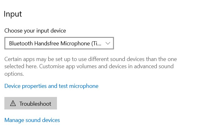 Under the sound settings I have the handsfree microphone option selected but there's no option to test my microphone (see below). I've troubleshoot but it doesn't detect a problem.