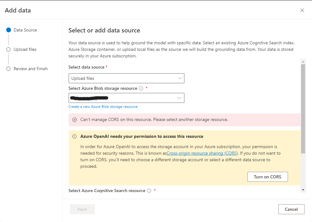 @Arun Adiththan I think it is most likely that the required permissions are not available for the user to set CORS on the account that you have selected. You can try to manually set CORS on the storage account from Azure portal and then try to use the account. Navigate to the storage account and set the following permissions on CORS as seen in screen shot and allow all origins & headers by keying in *.