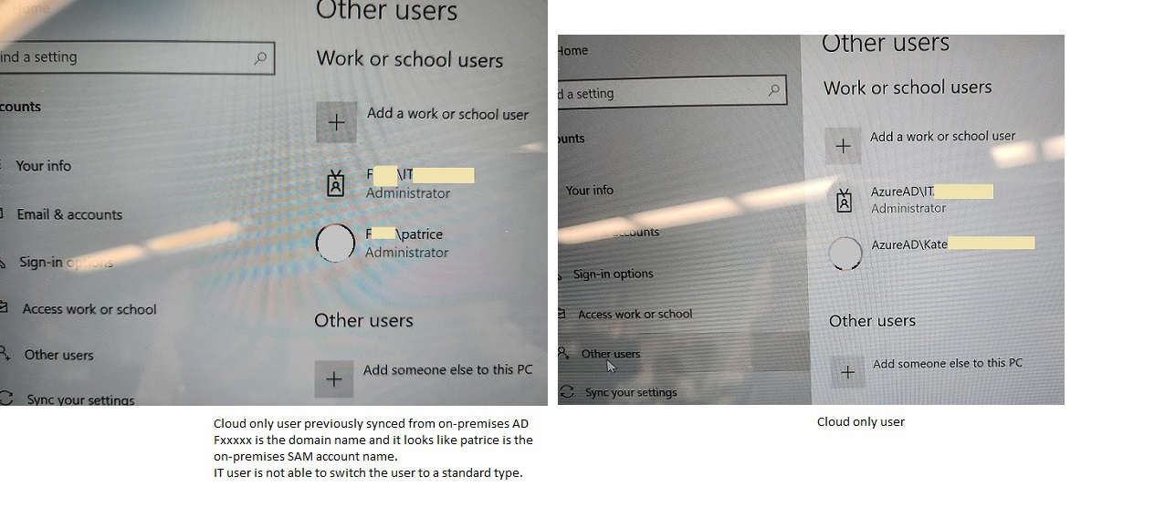For the Azure AD joined device, the account under Access wok or school is DomainName\user instead of AzureAD\user