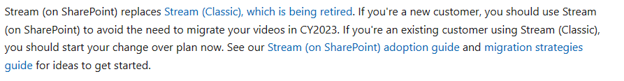 So I would recommend migrating files to Stream (on SharePoint) and using Stream (on SharePoint) as the primary way to manage video in the future.