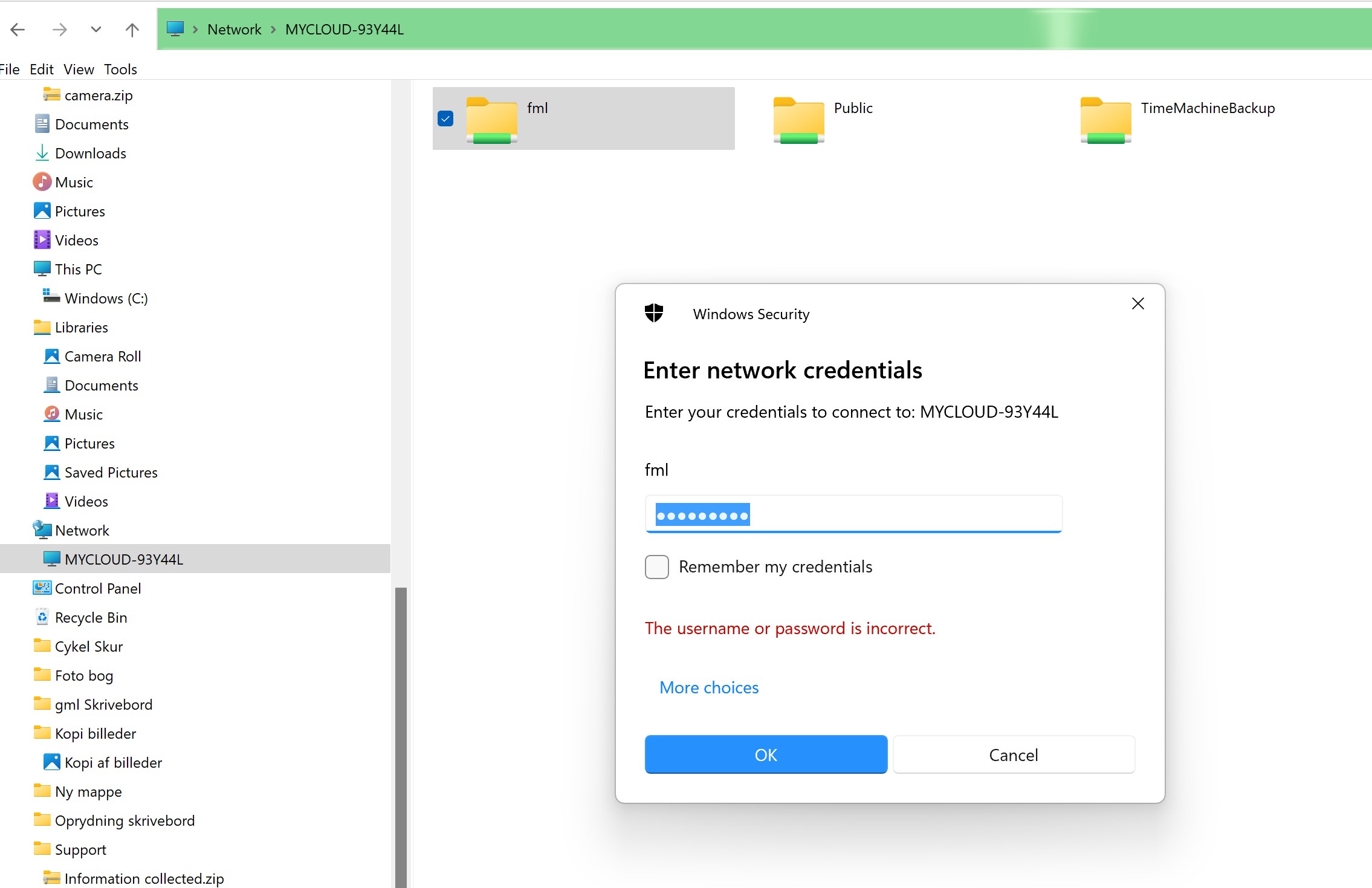 The user folder "fml" cannot be opened with username and associated code - cannot read security on the folder - gets the error username or the code is incorrect.