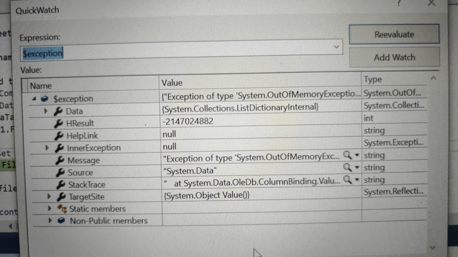 dt.Merge(xlData, true, MissingSchemaAction, Add); //---getting error out of memory here