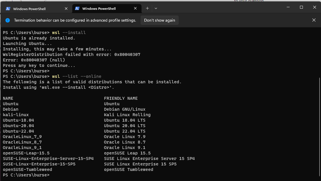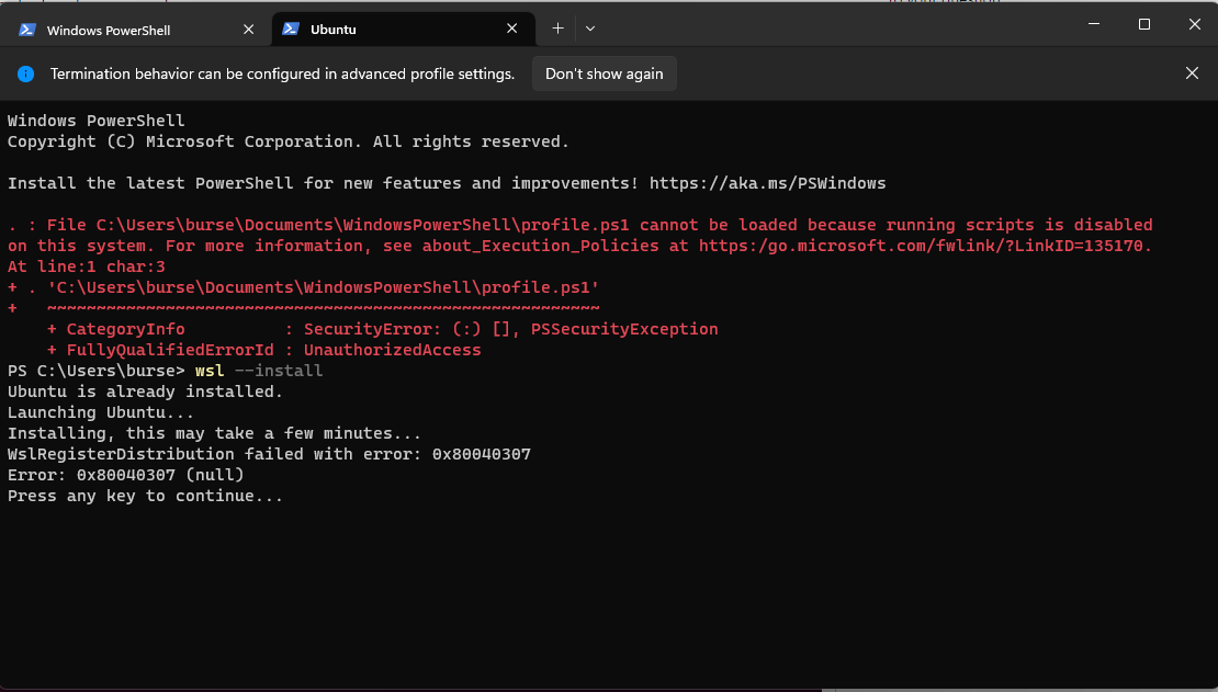 Why does my Powershell Window fail when Ubuntu and Ubuntu-22.04 is started?